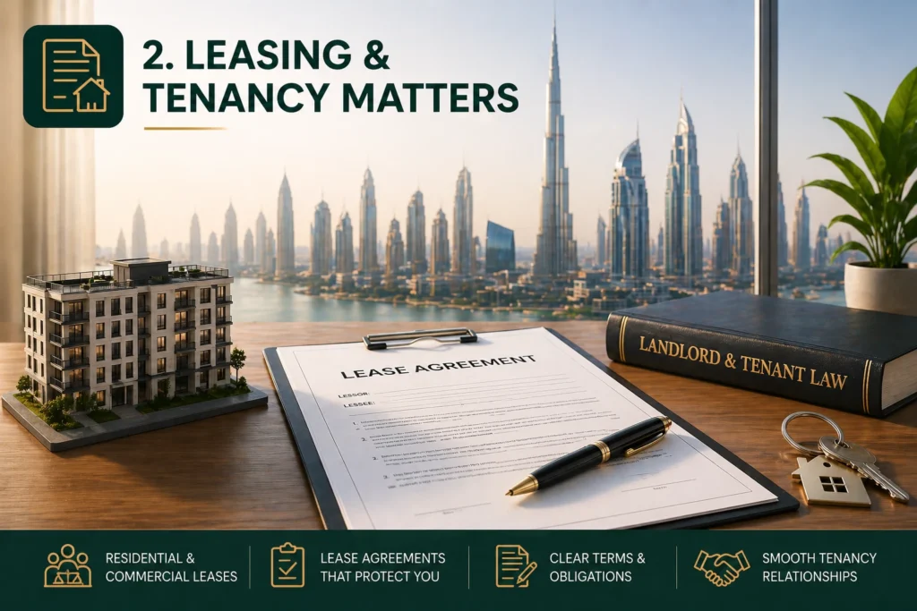 Our team advises landlords and tenants on residential and commercial leases, ensuring agreements comply with Dubai property law and clearly define obligations, payment terms, and dispute mechanisms. Guidance is provided by a qualified property lawyer Dubai professional.